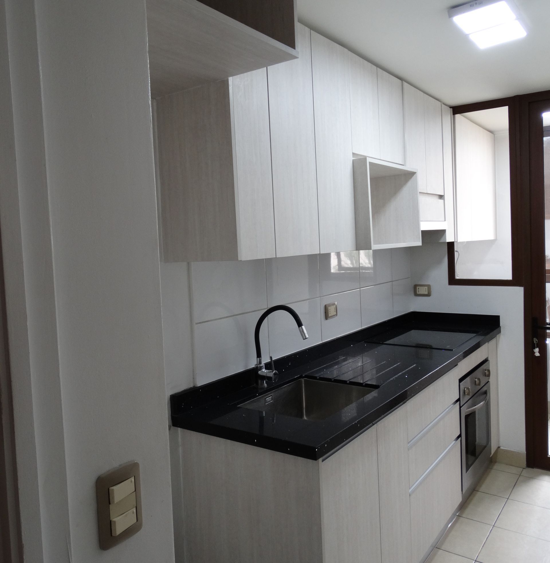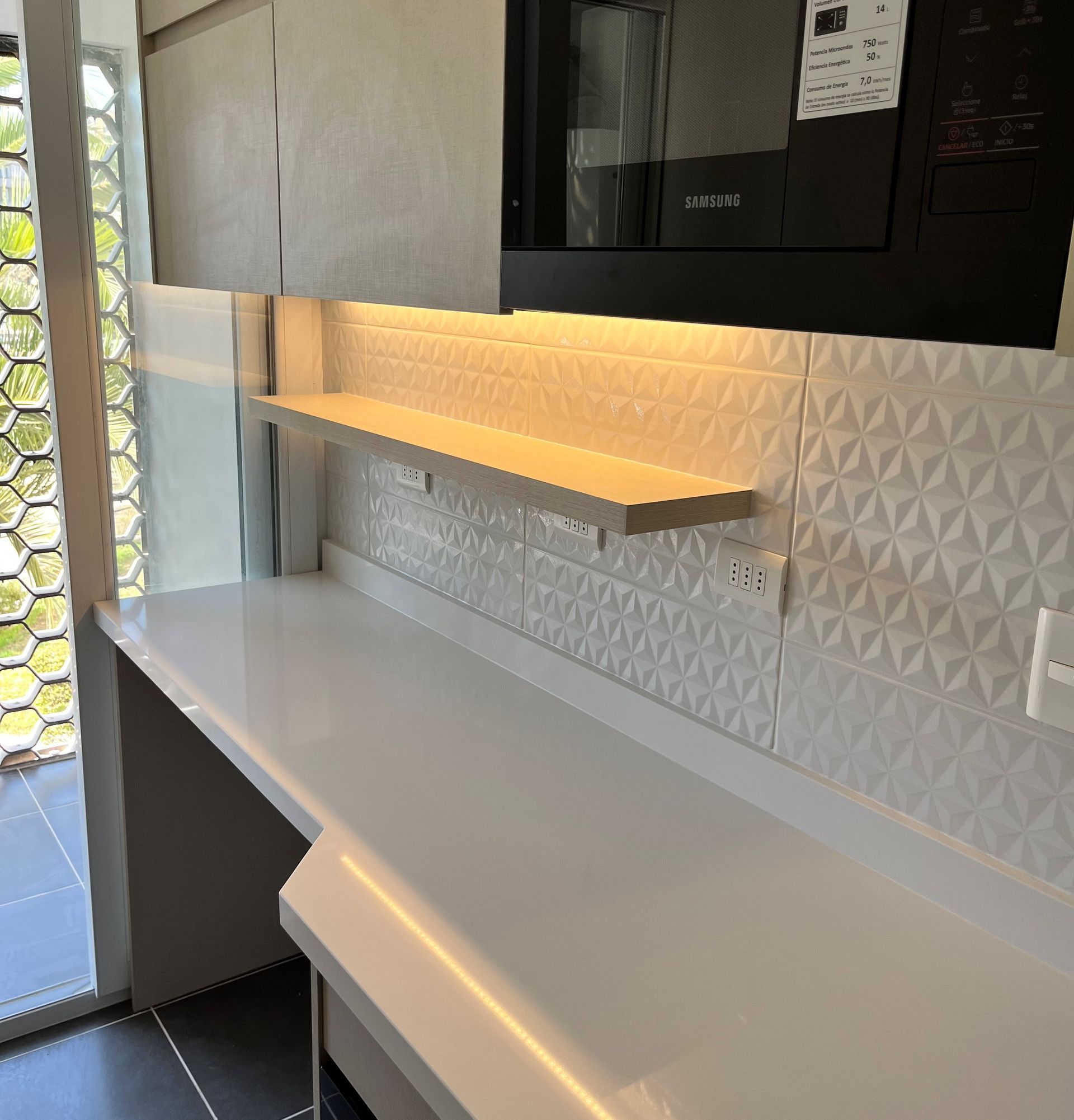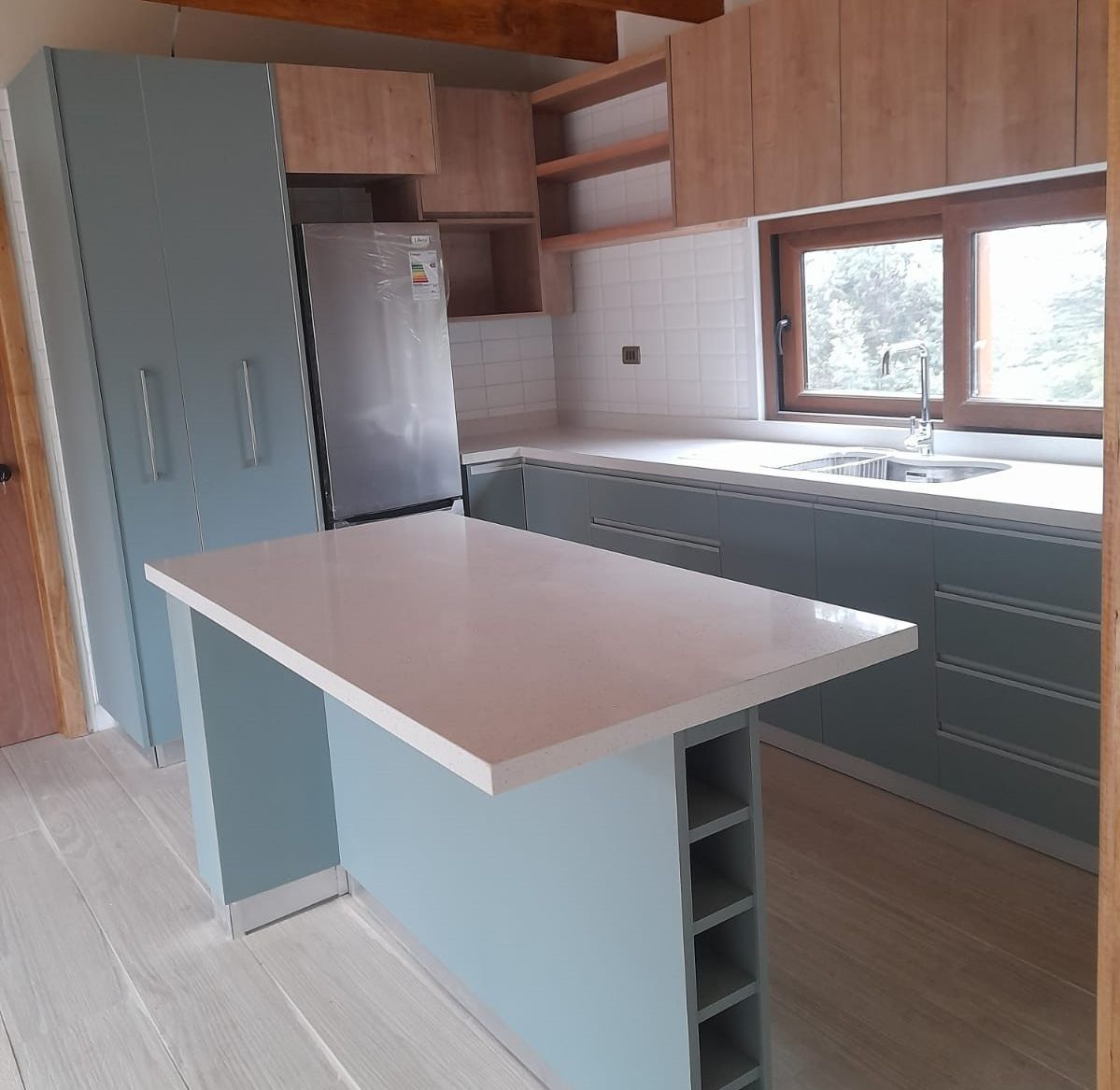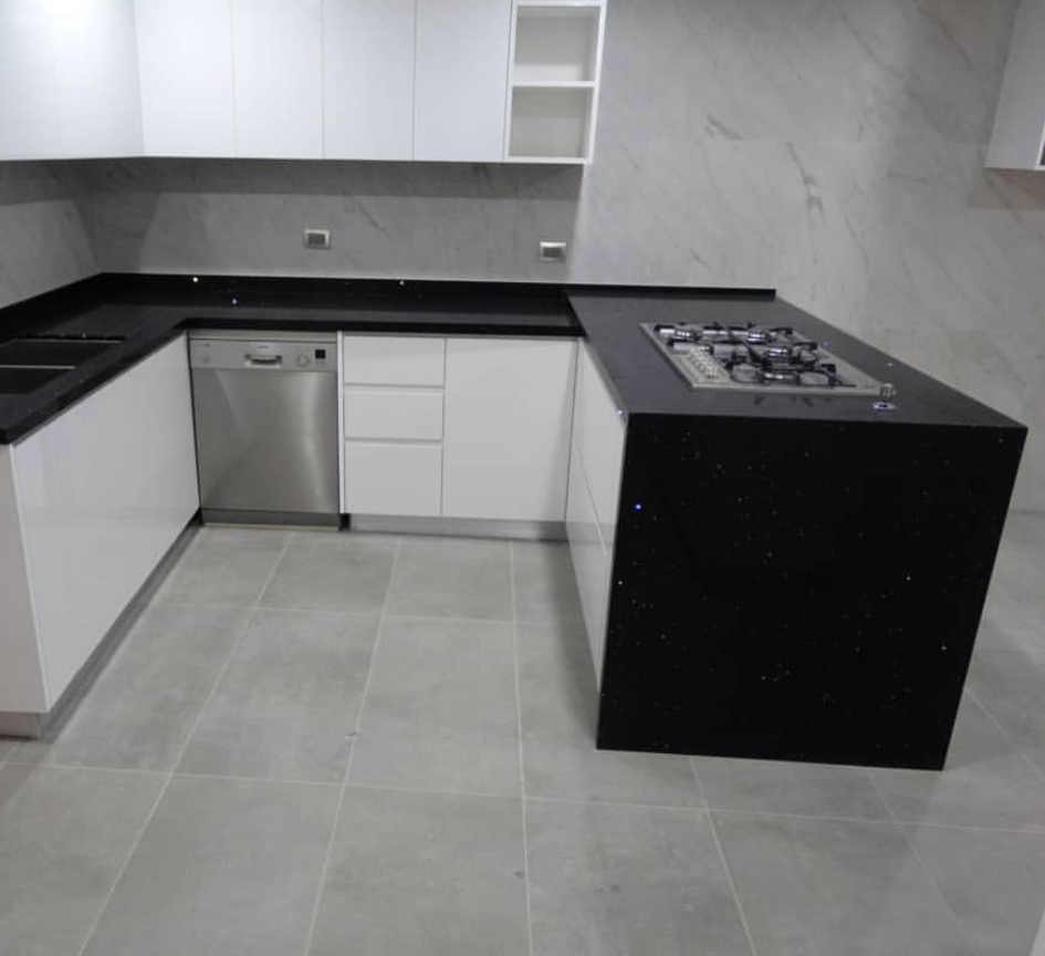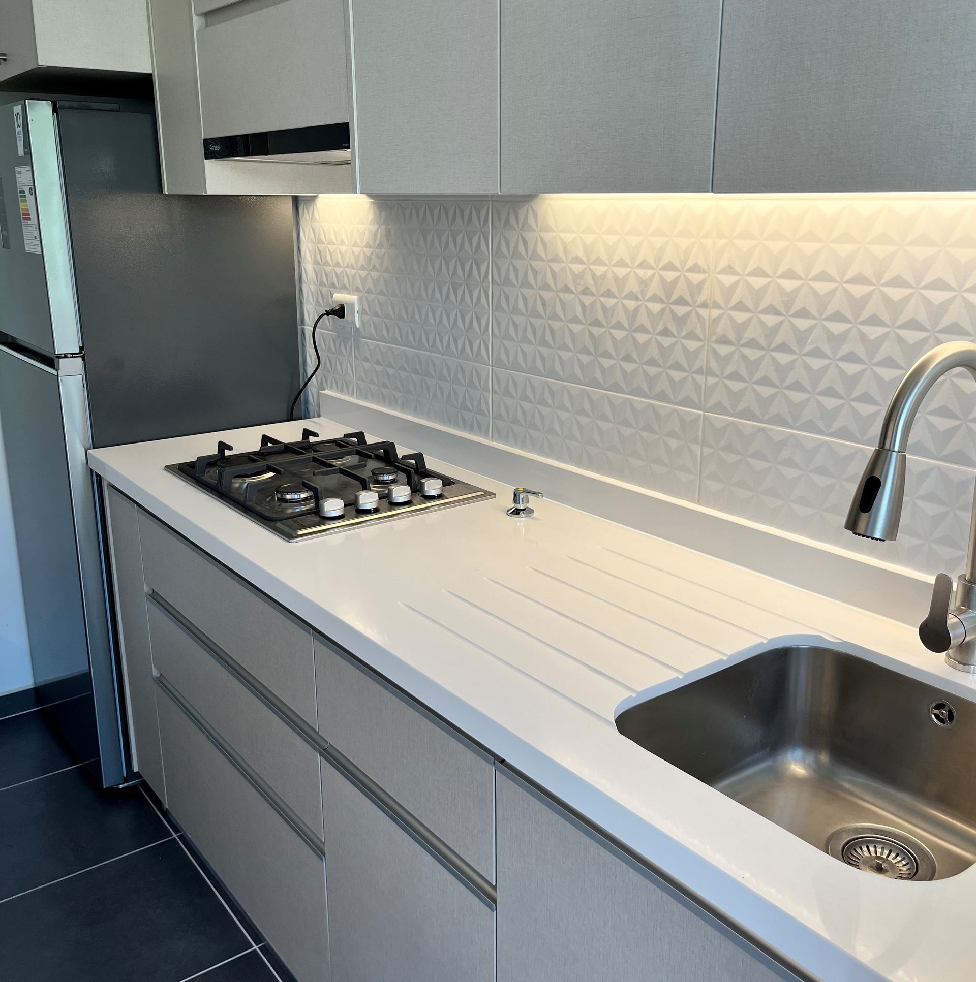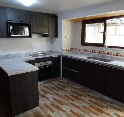 El módulo va montado sobre soportes de PVC, la instalación de la cocina se complementa con zócalo de PVC color aluminio de 10cm. y cubierta de granito o cuarzo.