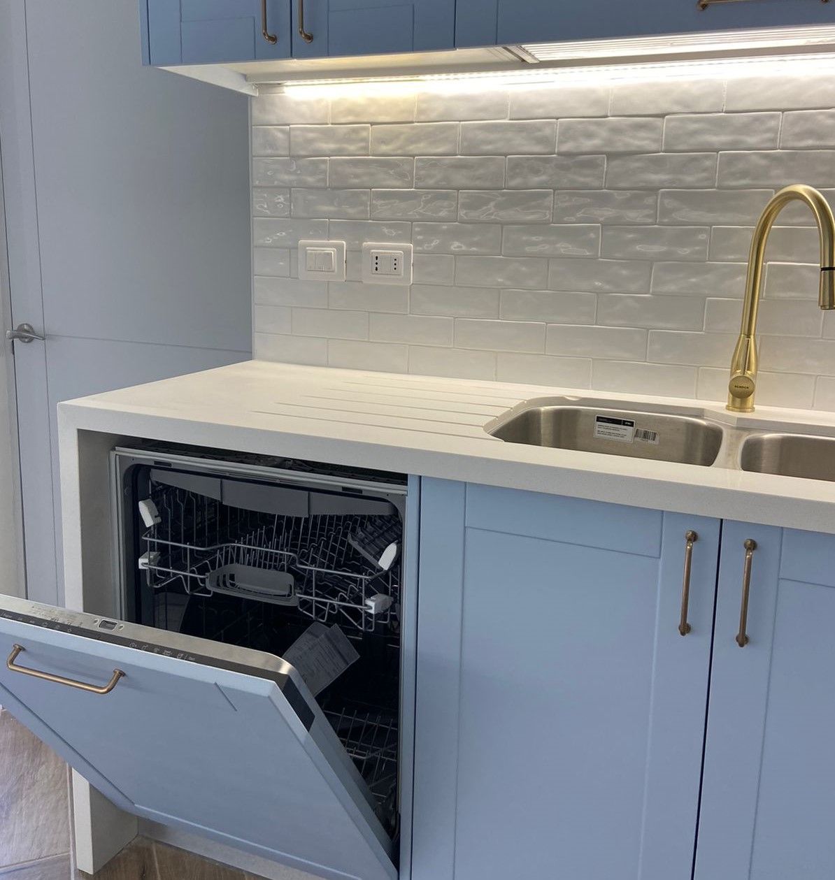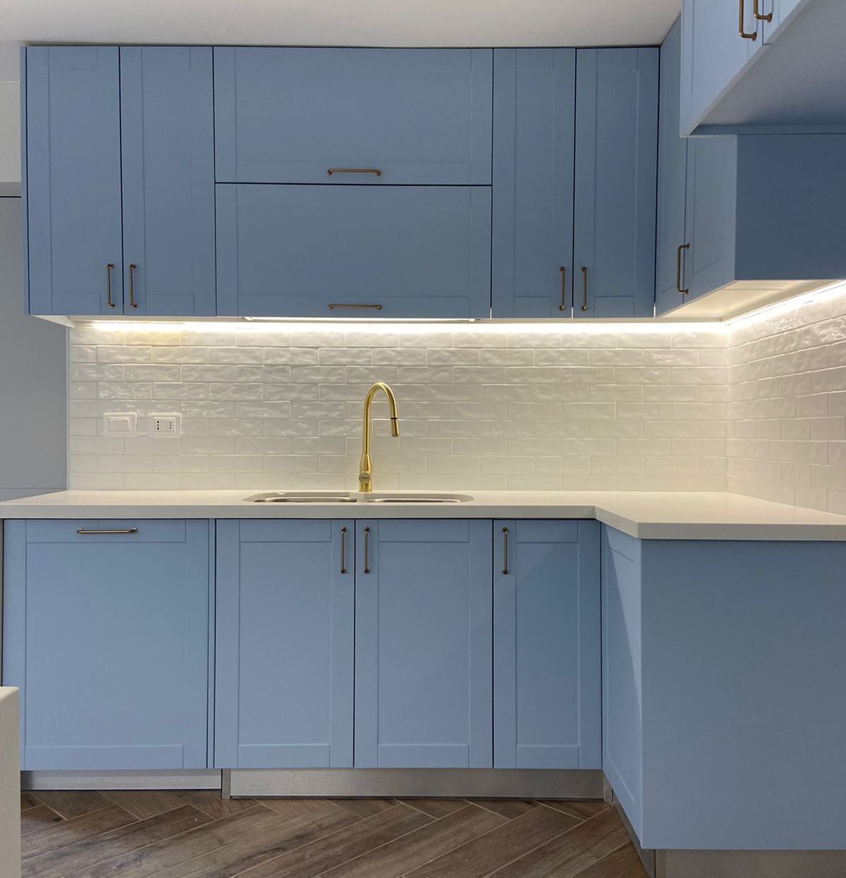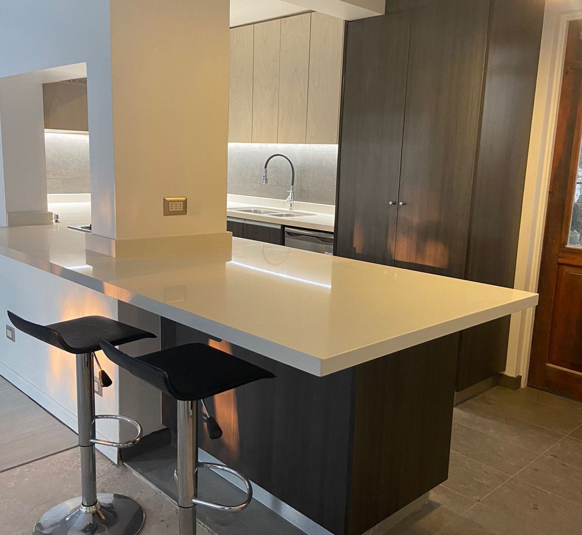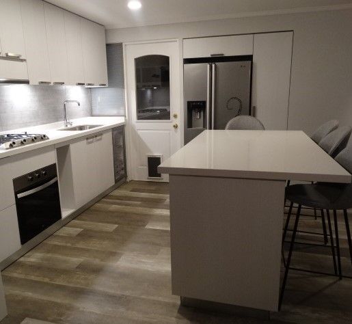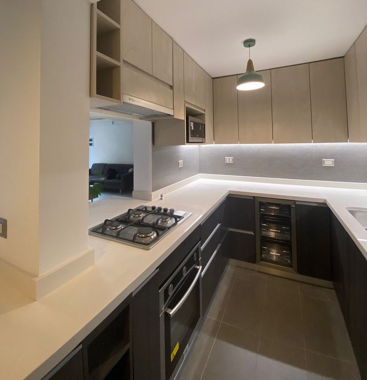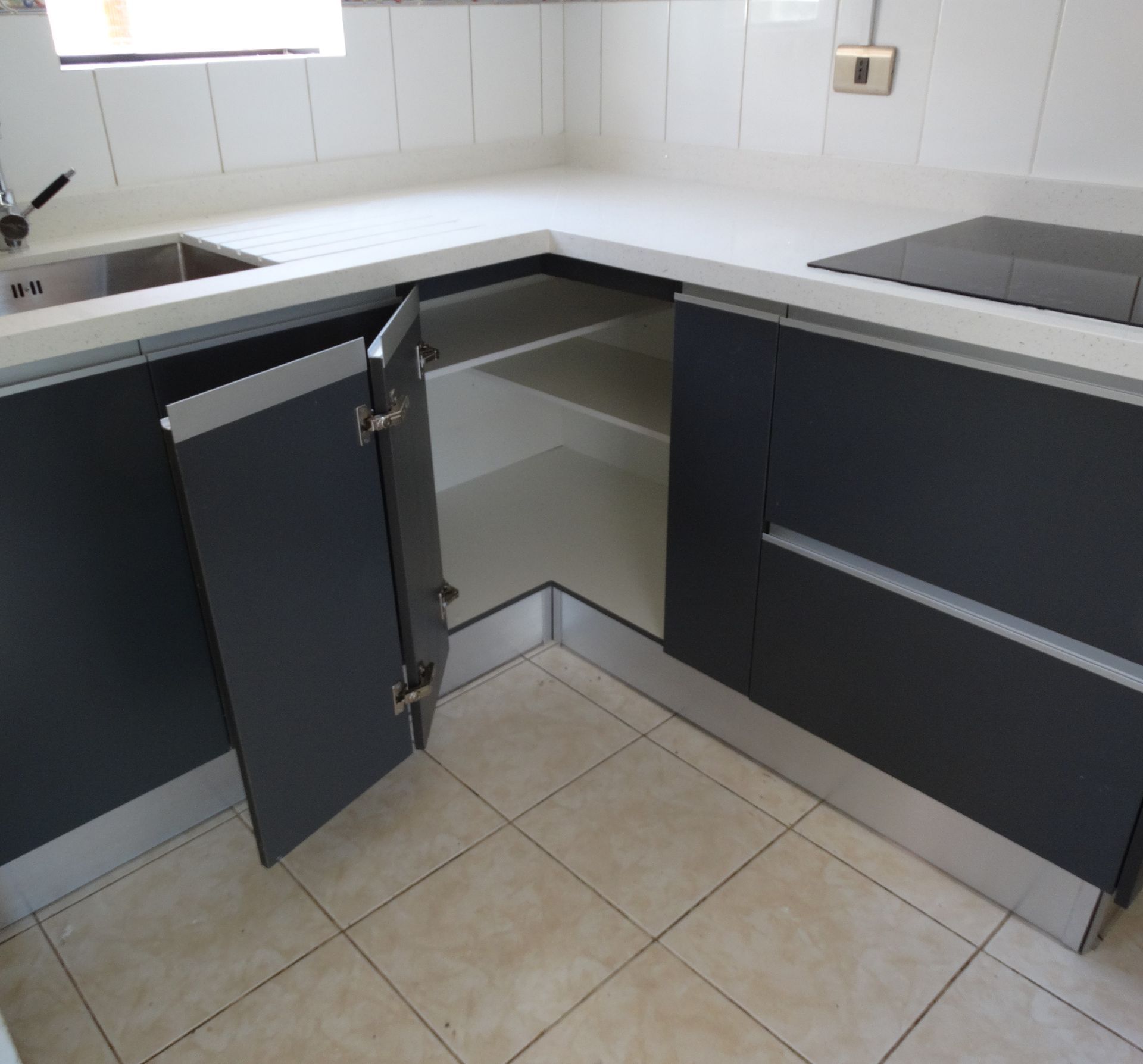 El módulo va montado sobre soportes de PVC, la instalación de la cocina se complementa con zócalo de PVC color aluminio de 10cm. y cubierta de granito o cuarzo.