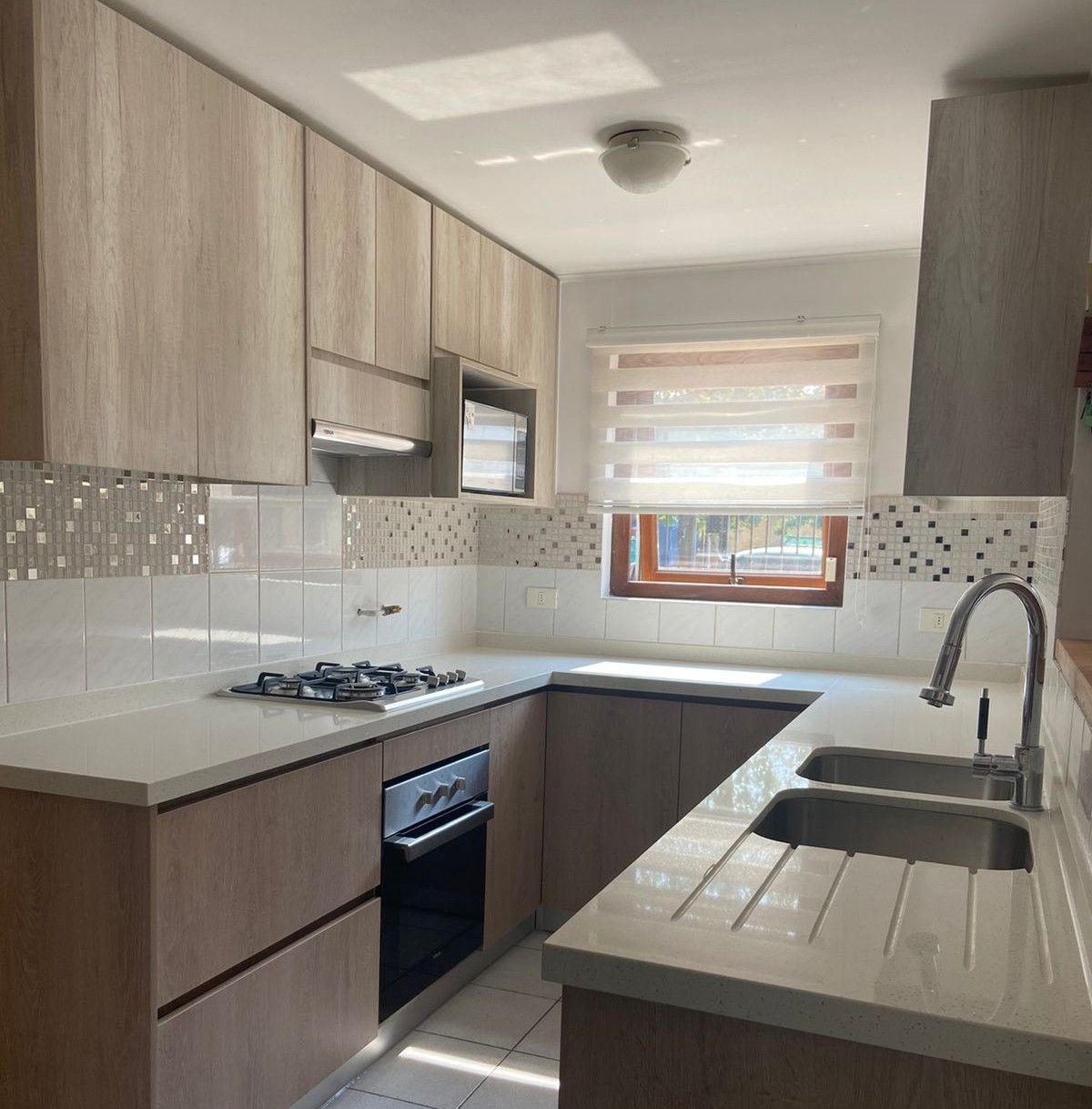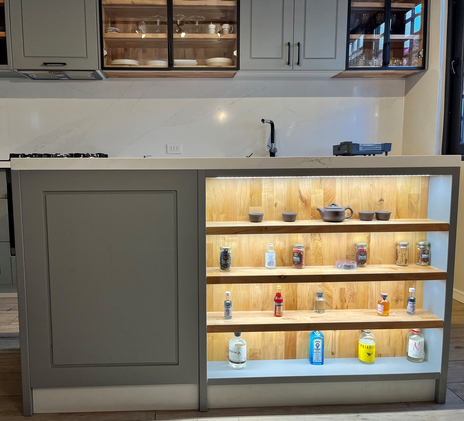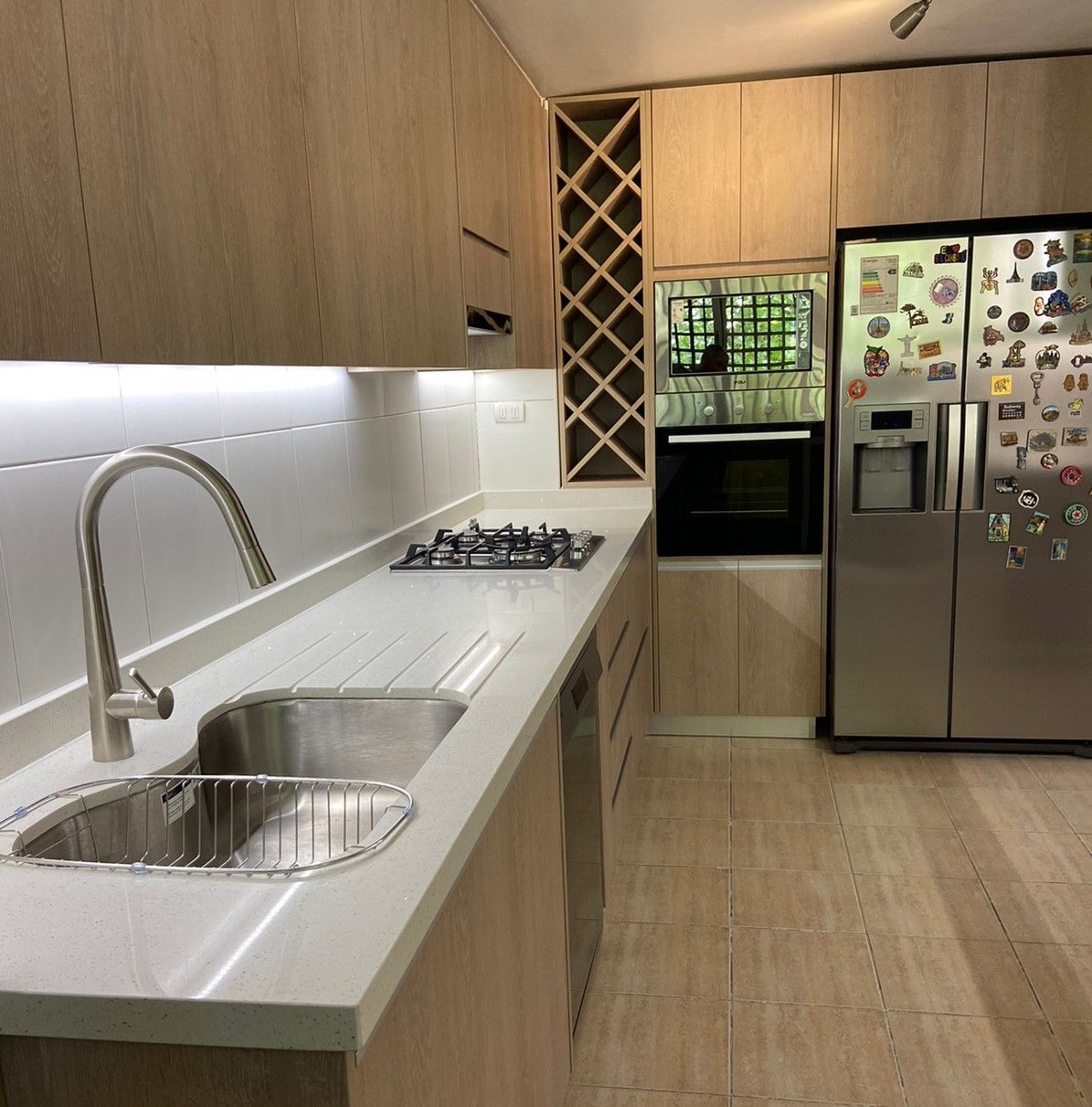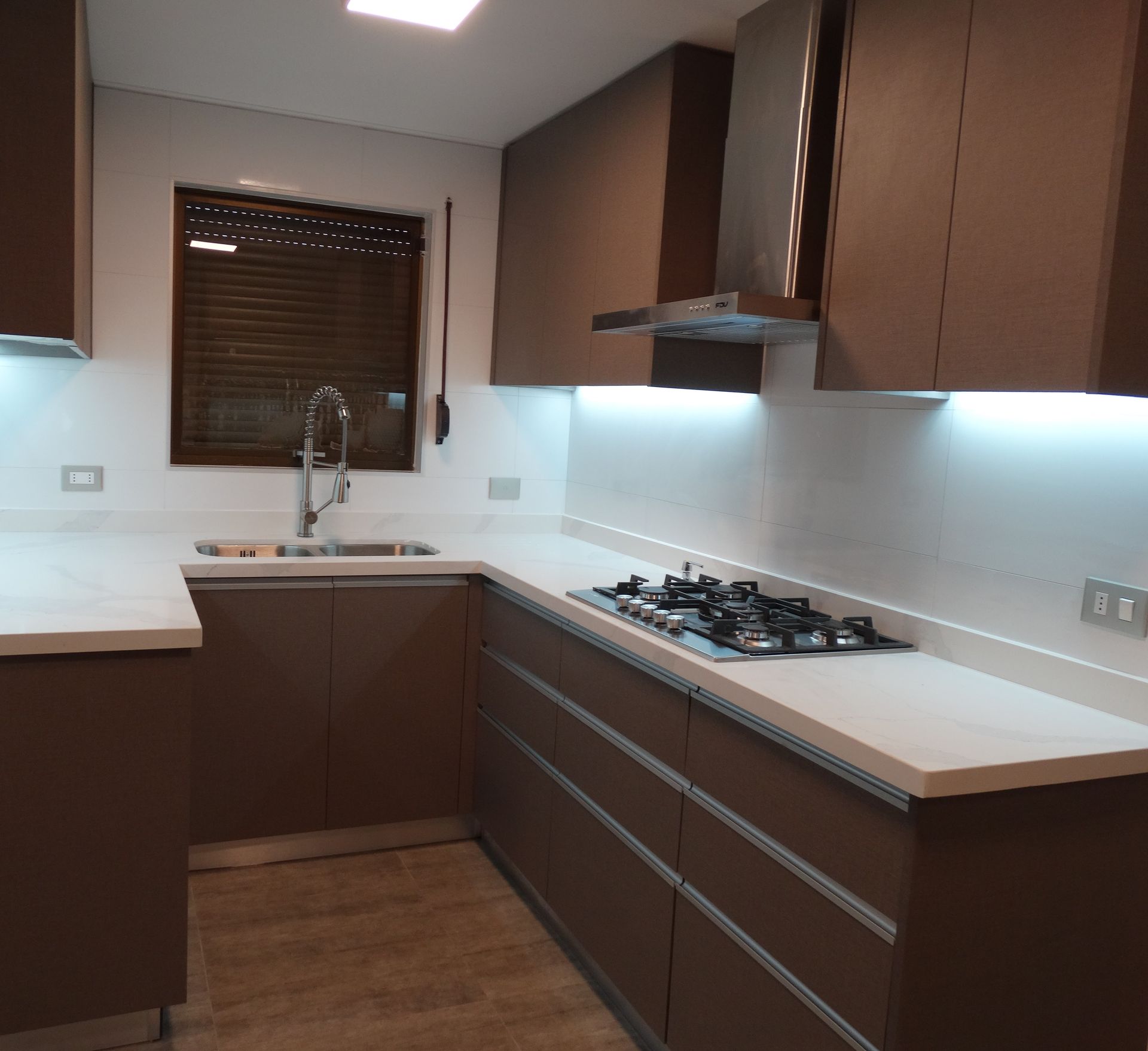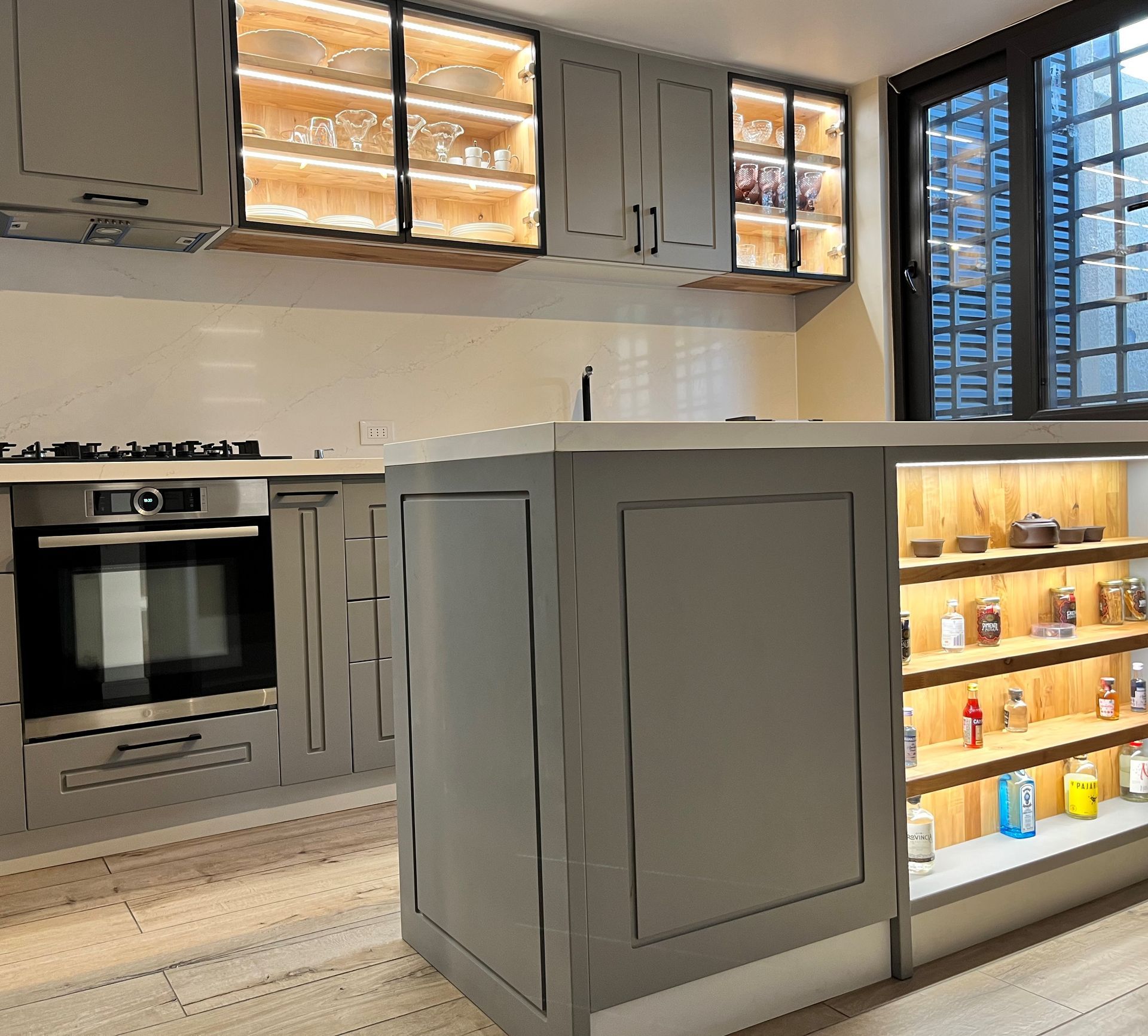 El módulo va montado sobre soportes de PVC, la instalación de la cocina se complementa con zócalo de PVC color aluminio de 10cm. y cubierta de granito o cuarzo.