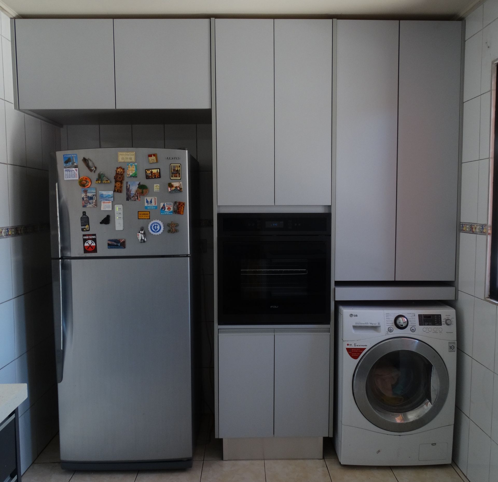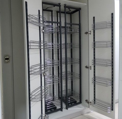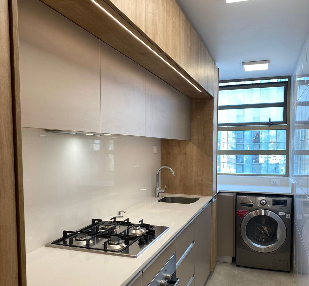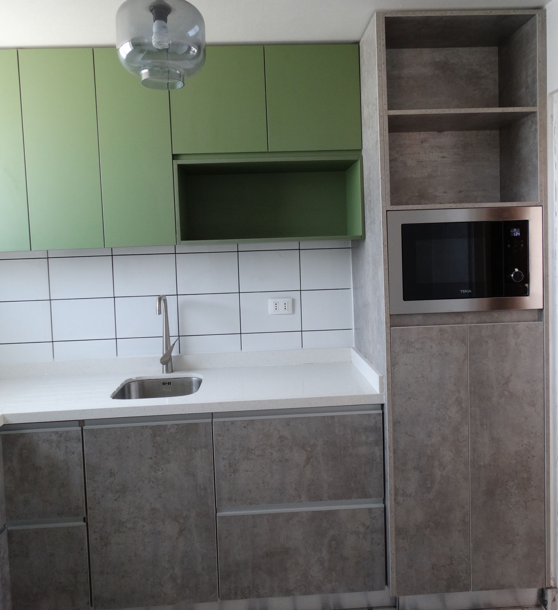 Modulos funcionales con estructura interior de melamina de 15mm color blanco y puertas en melamina de 18mm colores a elección. Con bisagras de cierre suave y tirador corrido de aluminio. Para los cajones se utiliza guía oculta de cierre suave.