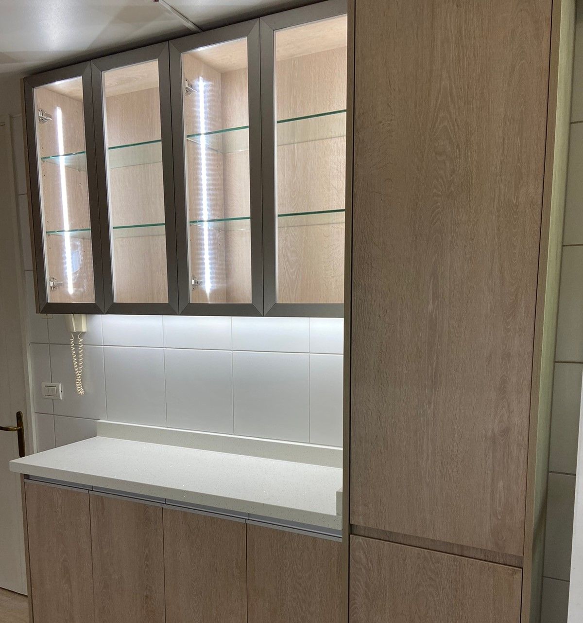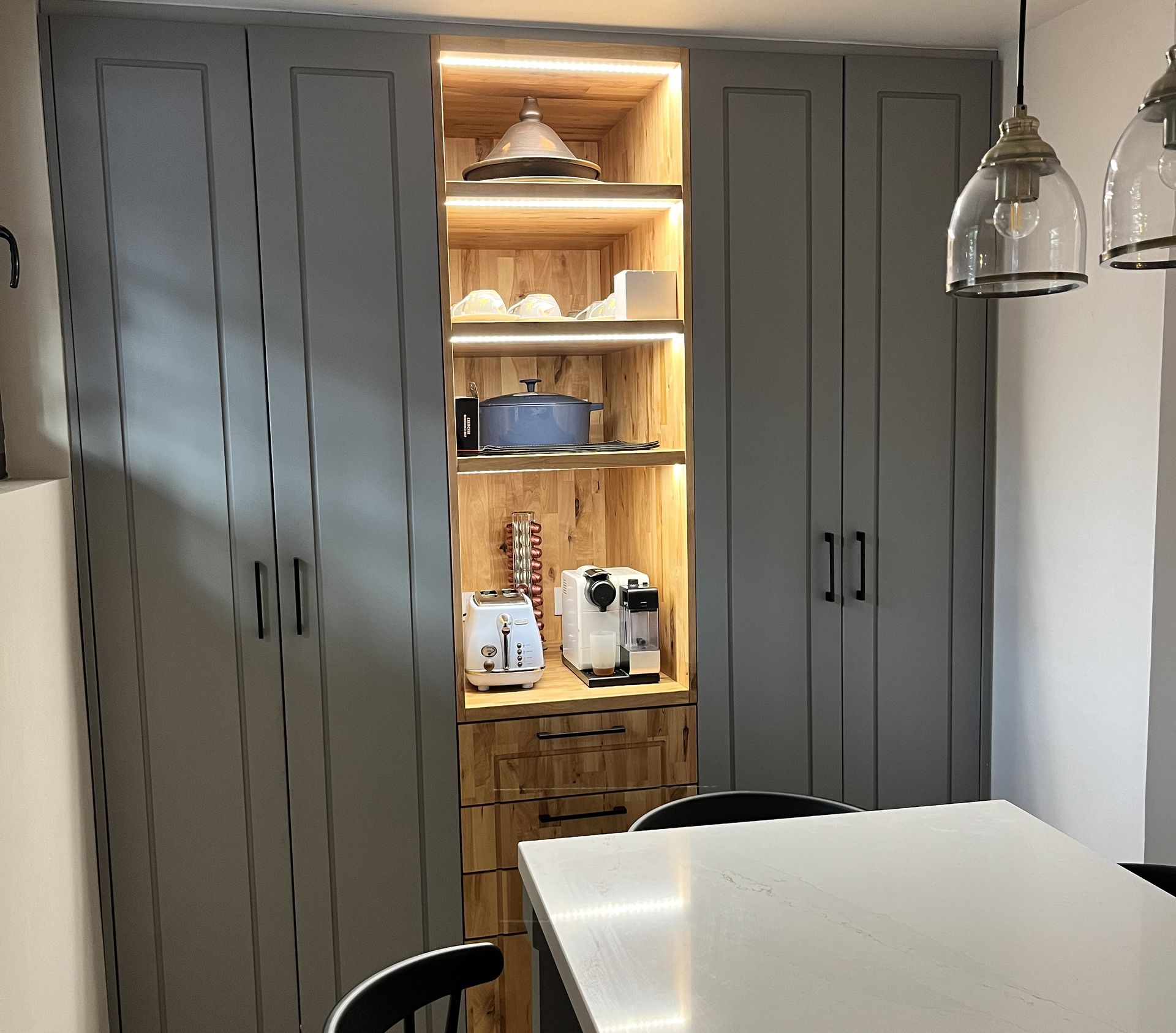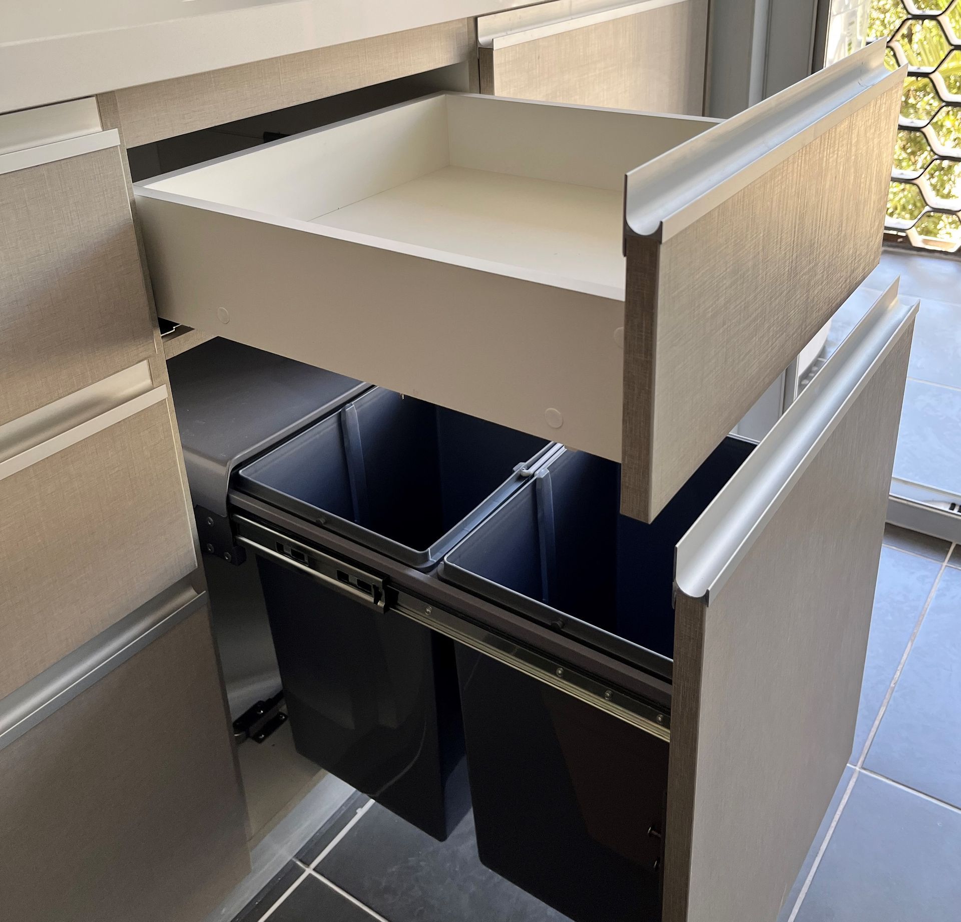 Modulos funcionales con estructura interior de melamina de 15mm color blanco y puertas en melamina de 18mm colores a elección. Con bisagras de cierre suave y tirador corrido de aluminio. Para los cajones se utiliza guía oculta de cierre suave.